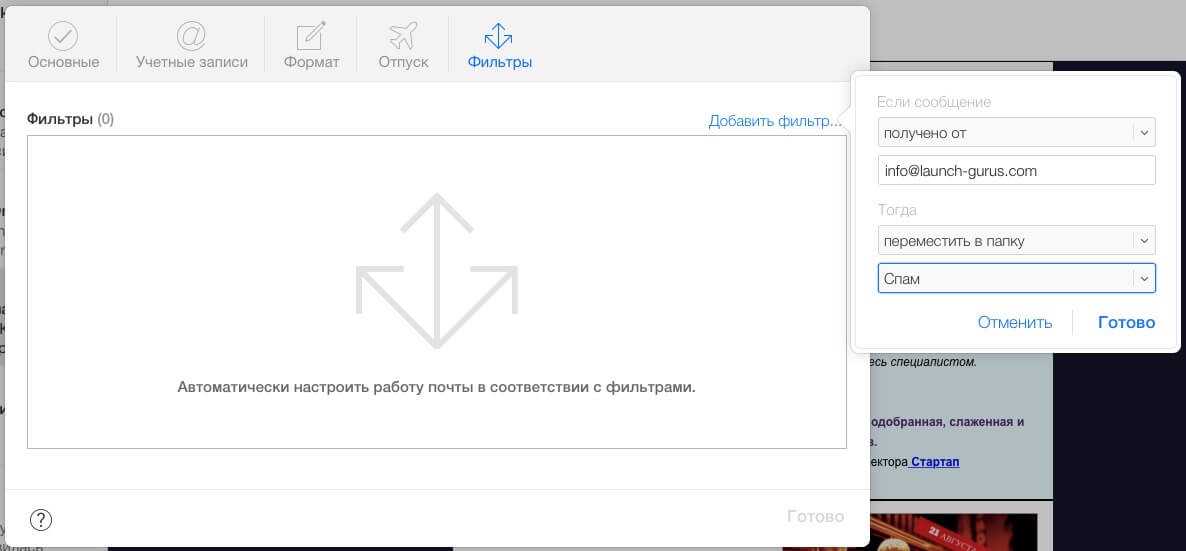 После добавления фильтров спам-письма действительно стали приходить гораздо реже. При появлении очередного такого адреса просто настраивайте для него новый фильтр.