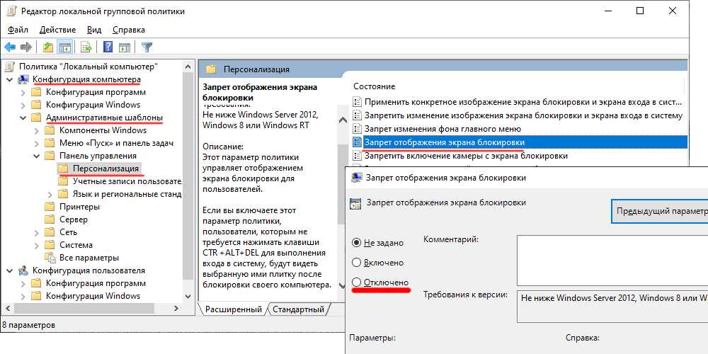 Ищем ветку «Запрет отображения экрана блокировки», дважды кликаем на ней, после всплытия окошка настройки блокировки экрана выбираем нужный указатель, подтверждаем изменения и перегружаем компьютер.