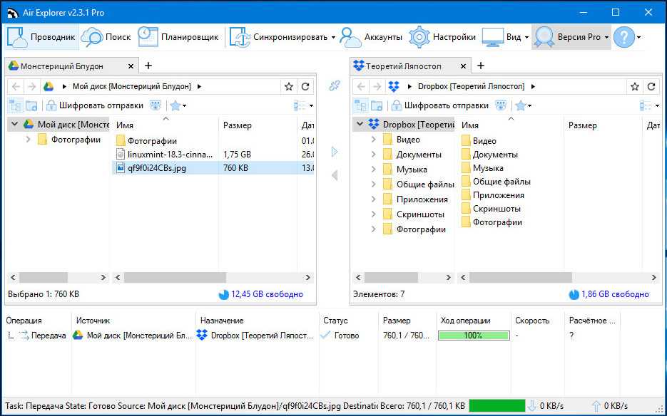 Удобный инструмент для управления и обмена файлами между разными облачными хранилищами. Программа работает с двумя десятками популярных сервисов, среди которых есть Google Drive, Dropbox, One Drive, Mega, Amazon, Mail.ru и Яндекс.Диск, реализована поддержка протоколов FTP, SFTP и WebDAV. Внешне Air Explorer представляет собой двухпанельный файловый менеджер, при подключении облачных хранилищ их содержимое отображается в правой и левой колонке.