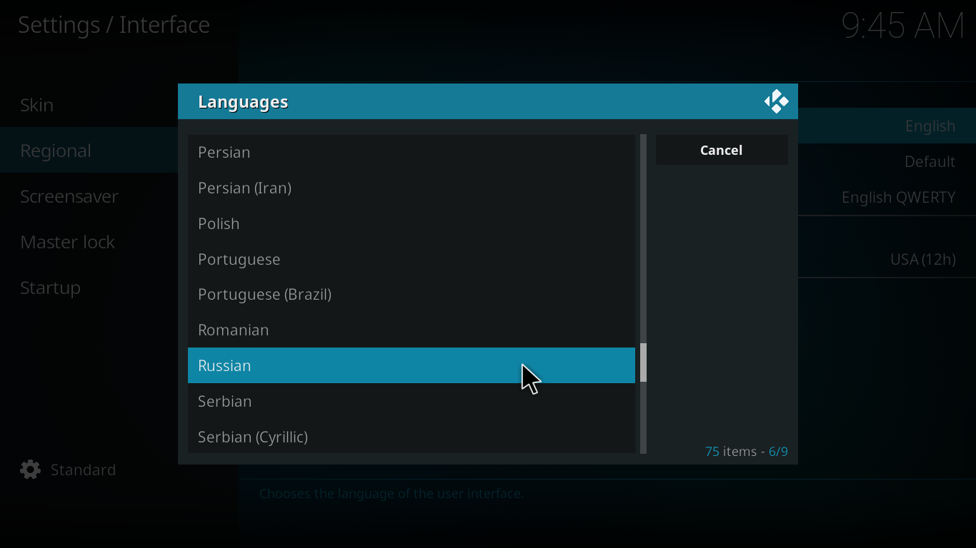 После того, как Kodi скачается и установится на устройство, запускается оно на английском языке. Чтобы настроить язык на русский, зайдите в «Setting» (значок шестеренки), затем «Interface Settings» -> «Regional».