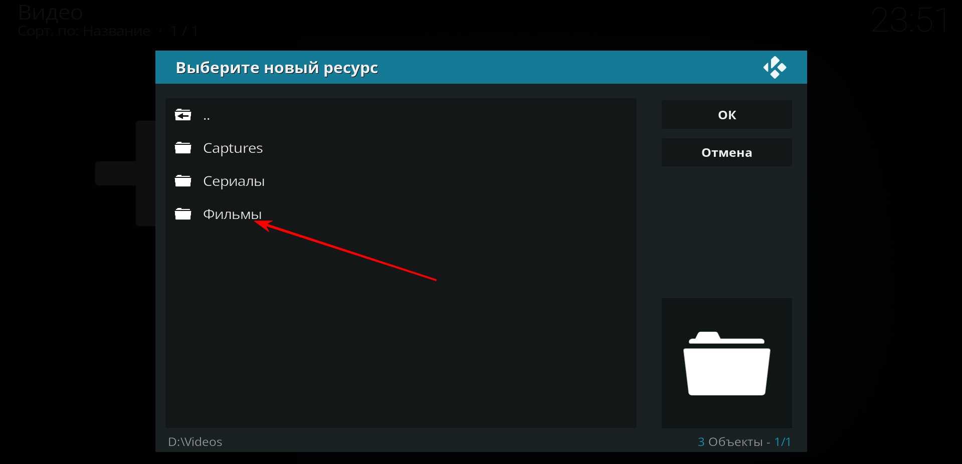 Далее «тапаем» на папку «Фильмы» и нажимаем «ОК».