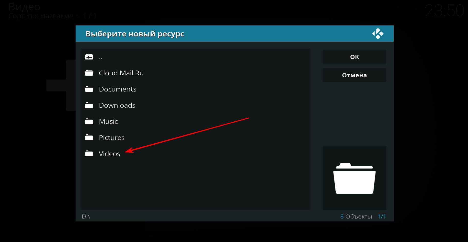 на котором лежат те же самые папки, и мы выбираем папку «Videos».
