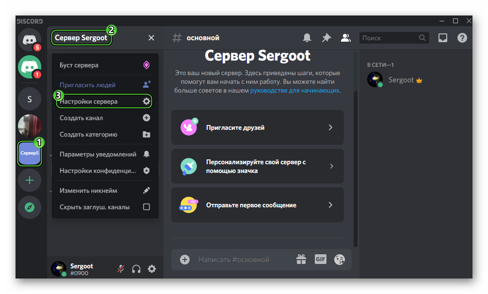 - С главного меню сервера сразу увидите 3 кнопки: «Пригласите друзей», «Персонализируйте свой сервер с помощью значка» и «Отправьте первое сообщение».