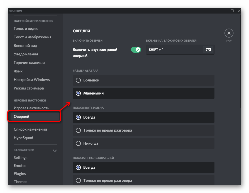 Следом перейдите в категорию «Оверлей» и просмотрите все присутствующие там параметры. У вас есть возможность как полностью отключить внутриигровой оверлей, отображающий аватарки всех подключенных пользователей, их сообщения и индикаторы включенного микрофона, так и выставить его параметры под себя. Например, горячей клавишей включается или отключается блокировка оверлея, позволяя вам вручную выбрать режим окон, настроить их прозрачность и остальные пункты. Детально об этом описано в другой статье на нашем сайте.