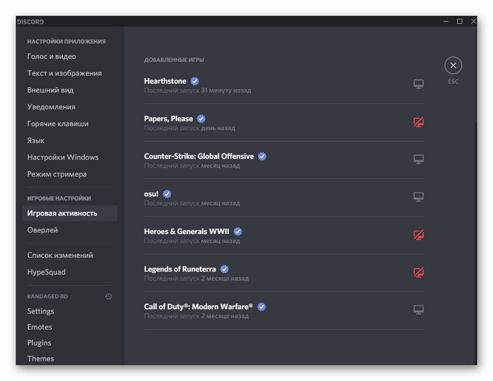 Ниже находится список с добавленными играми, который формируется автоматически, если вы запускаете их при активном Discord. Напротив каждой игры отображаются значки с экранами, и если какие-то горят красными, значит, режим слежения за игровой активностью отключается во время запуска указанного приложения.