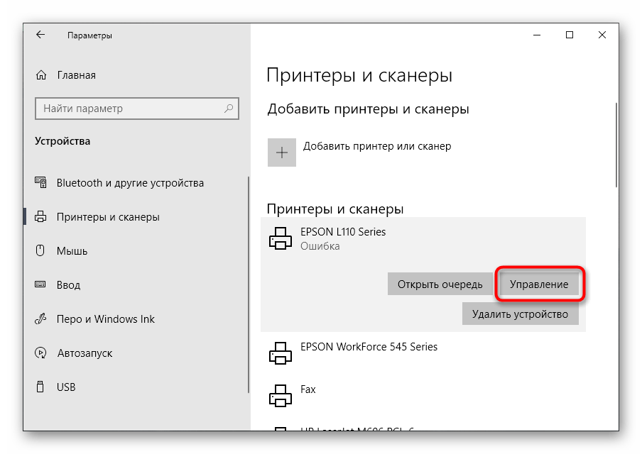 - Во вкладке «Принтеры и сканеры» выбрать нужную модель и щёлкнуть на «Управление».