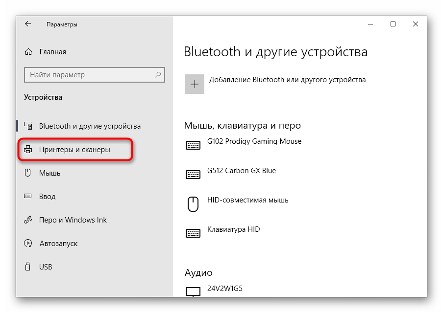 Через меню слева переключитесь в «Принтеры и сканеры».