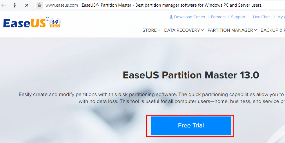 Перейти по URL: https://www.easeus.com/partition-manager/ и нажать «Free Trial».
