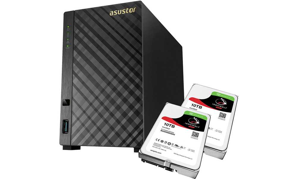 При подготовке нашего руководства мы использовали сетевой накопитель ASUSTOR AS1002T. Данная модель оснащена двуядерным процессором Marvell ARMADA 385 с частотой 1 ГГц, имеет два отсека для установки 3,5-дюймовых дисков с интерфейсом SATA, гигабитный сетевой порт и два разъема USB 3.0.