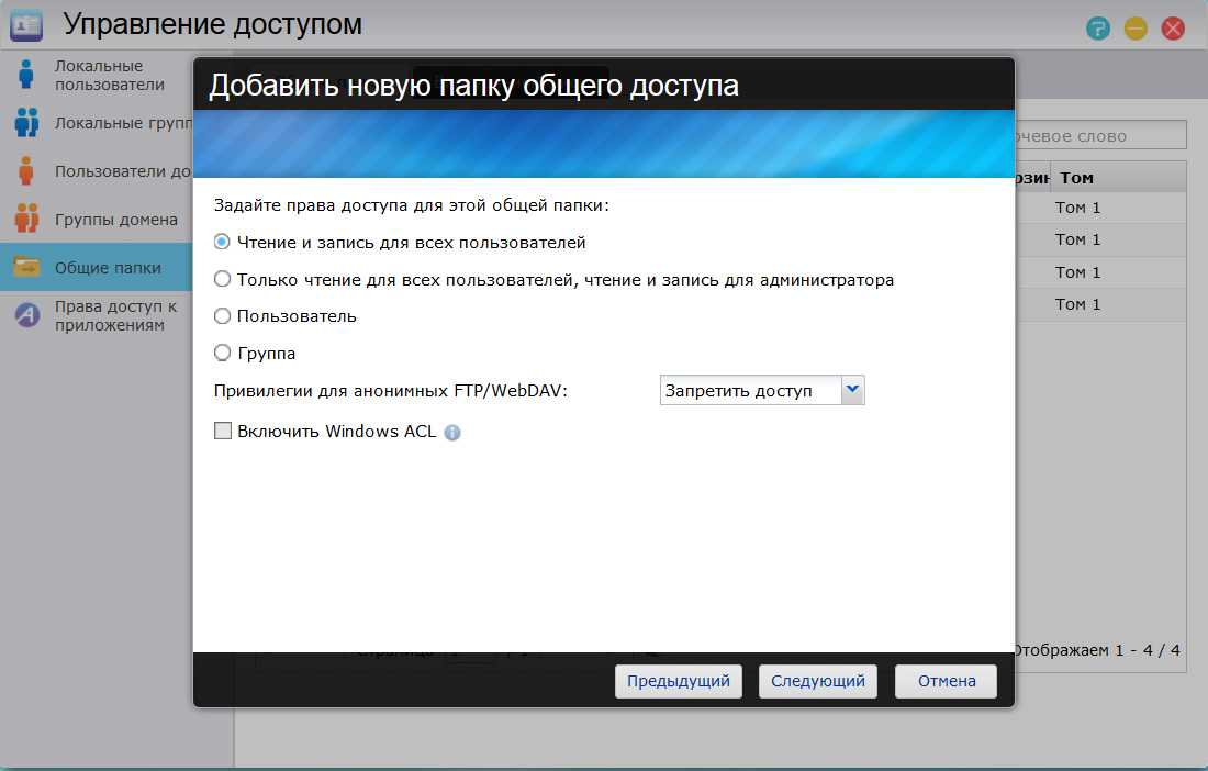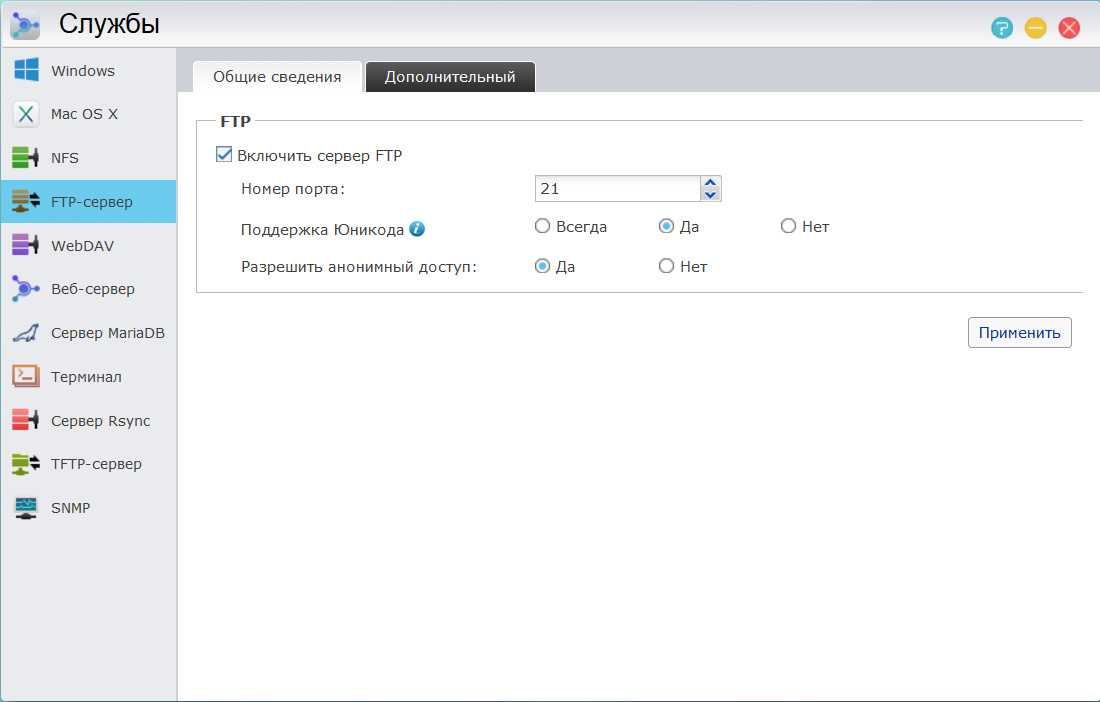 Из соображений безопасности мы рекомендуем включить данную опцию и завести пользователей в разделе «Управление доступом | Локальные пользователи». В противном случае все, кто узнает ip-адрес вашего NAS-накопителя, смогут загружать и скачивать файлы в соответствии с настройками прав доступа к публичным папкам. Нажмите «Применить», чтобы сохранить изменения.