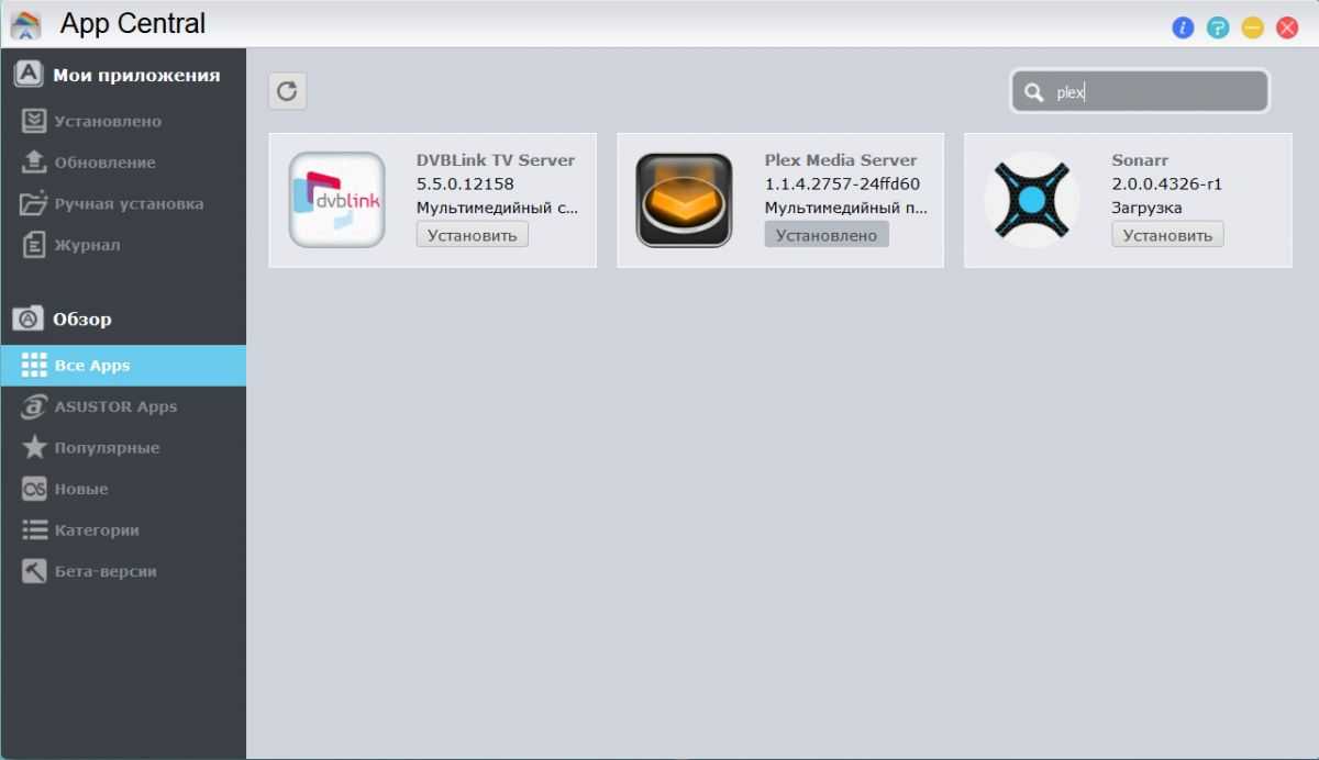 Для этого необходимо войти в «App Central | ASUSTOR Apps», найти в списке приложений Plex Server и начать его установку. После установки приложения запустите его кликом по значку приложения на главной странице интерфейса управления сетевым накопителем.