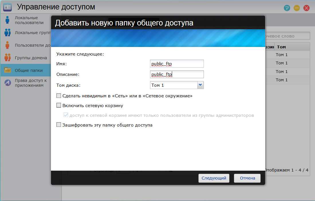 Для начала необходимо создать общую сетевую папку, в которой пользователи домашней сети смогут работать с файлами. Для этого откройте интерфейс управления NAS-диском, введя его ip-адрес в браузере, в разделе «Управление доступом | Общие папки» нажмите «Добавить» и укажите имя и описание папки, например, «public_ftp» (см. рис. слева).