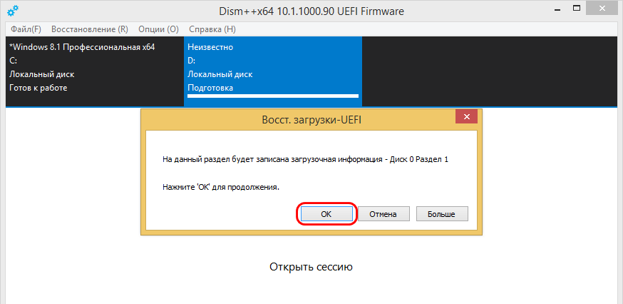 Dism++ выдаст уведомление о добавлении сведений о загрузке новой системы в загрузчик и попросит нажать «Ок» для старта операции.