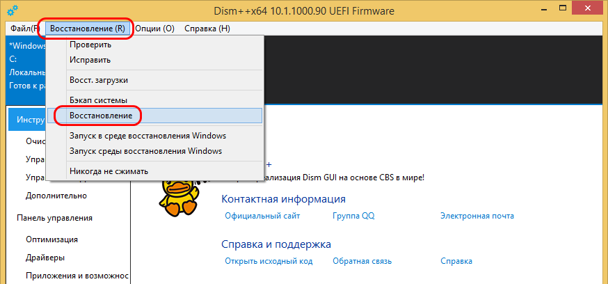 Монтируем установочный ISO-образ. Запускаем Dism++. Как и при переустановке, в меню «Файл» выбираем «Применить образ». Кстати, форму развёртывания образа Windows можно запускать также через меню «Восстановление», пункт «Восстановление». Эта форма идентична и для установки системы с файлов WIM/ESD дистрибутива, и для восстановления из бэкапа в формате этих же файлов.