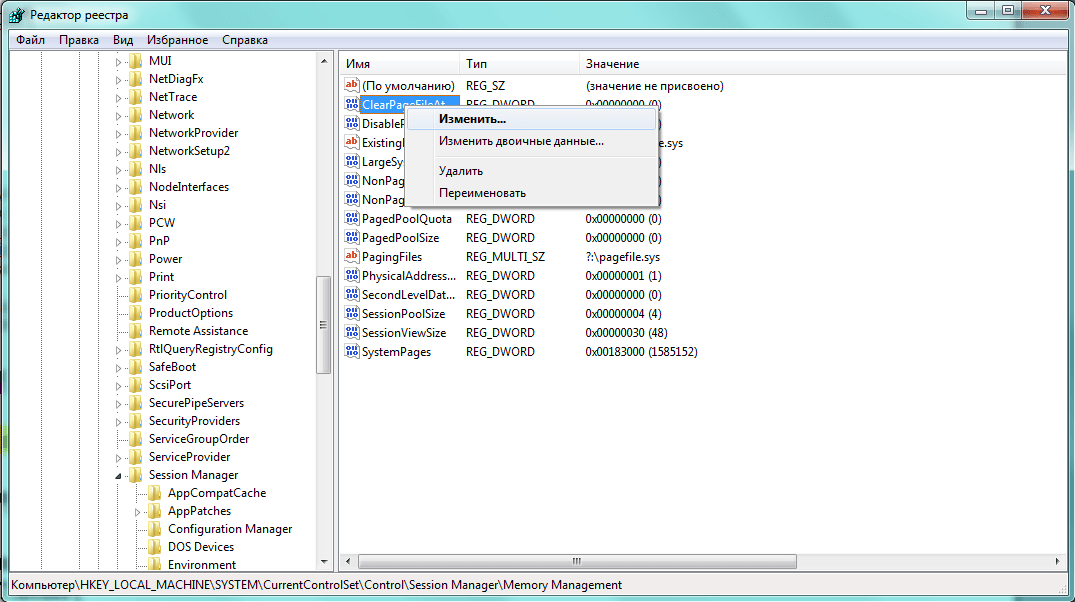 После того как мы выберем нужный каталог, в окне будет отображён перечень хранящихся в нём параметров. Выбираем ClearPageFileAtShutdown и нажимаем правую кнопку мышки, открывая всплывающее меню.