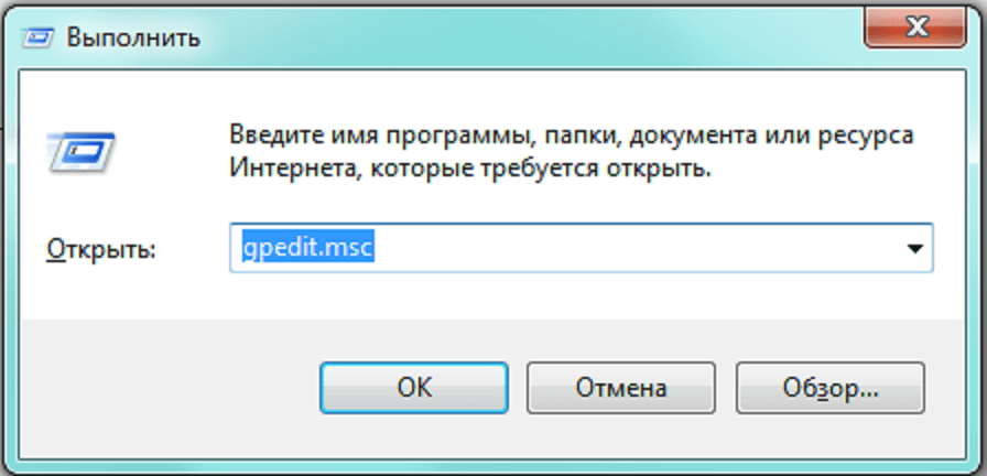 Нажимаем «Win»+R, в позиции ввода окна «Выполнить» набираем gpedit.msc, затем кликаем на экранную кнопку «ОК».