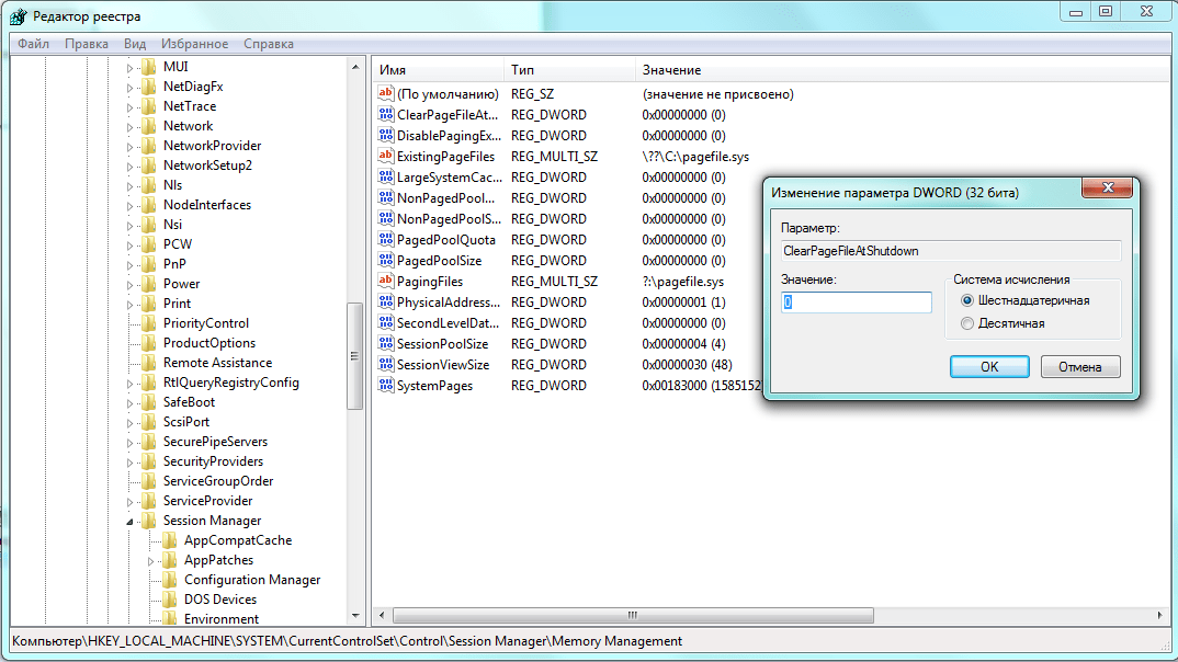 Реестр представлен в виде вложенных папок, двигаясь по дереву которых можно добраться до искомого параметра. Нам необходим ClearPageFileAtShutdown, который расположен здесь: HKEY_LOCAL_MACHINE\SYSTEM\CurrentControlSet\Control\Session Manager\Memory Management.