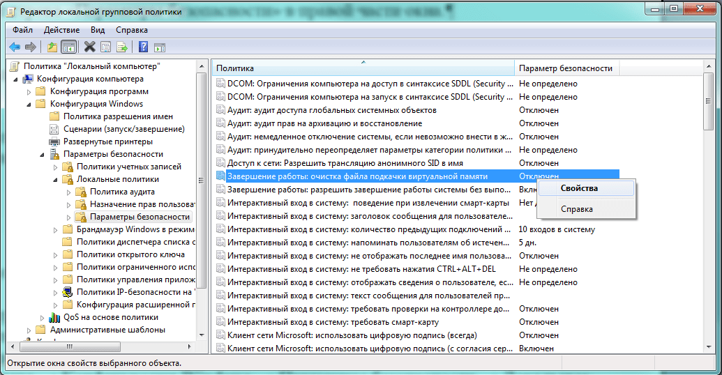 Мы у цели. В центральной трети окна находится длинный список, в котором разыскиваем «Завершение работы: очистка файла подкачки виртуальной памяти», затем активируем всплывающее меню, нажимая правую клавишу мышки. Поскольку «Справка» нам сейчас не нужна, останавливаемся на «Свойствах».