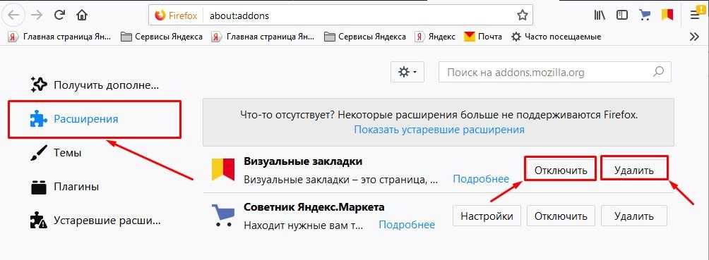В открывшемся окне в разделе «Расширения» найдите расширение «Визуальные закладки» и нажмите кнопку «Отключить» или «Удалить».