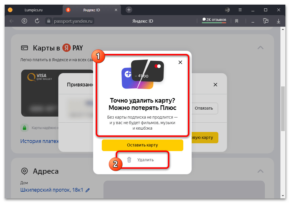 Чтобы выполнить удаление, необходимо нажать «Отвязать» под блоком с информацией о банковской карте и во всплывающем окне подтвердить процедуру с помощью кнопки «Удалить». Это приведет к моментальному отключению, даже если вы перед этим не деактивировали платную подписку.