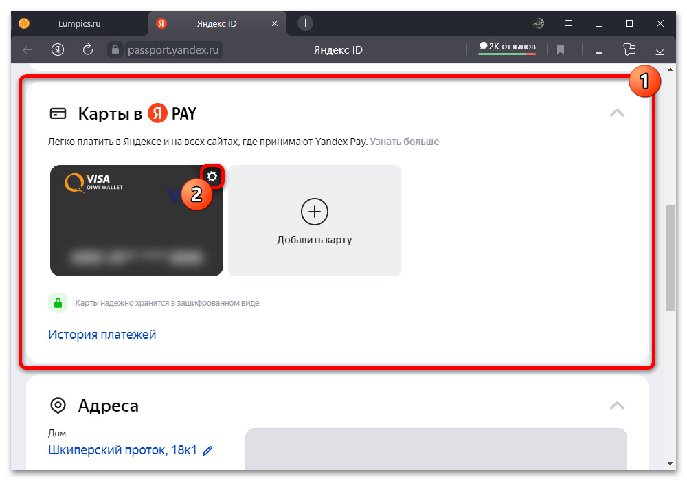 Разверните данный подраздел, наведите курсор мыши на превью банковской карты и в правом верхнем углу воспользуйтесь кнопкой с изображением шестеренки. Это приведет к открытию более подробной информации о выбранном способе оплаты.