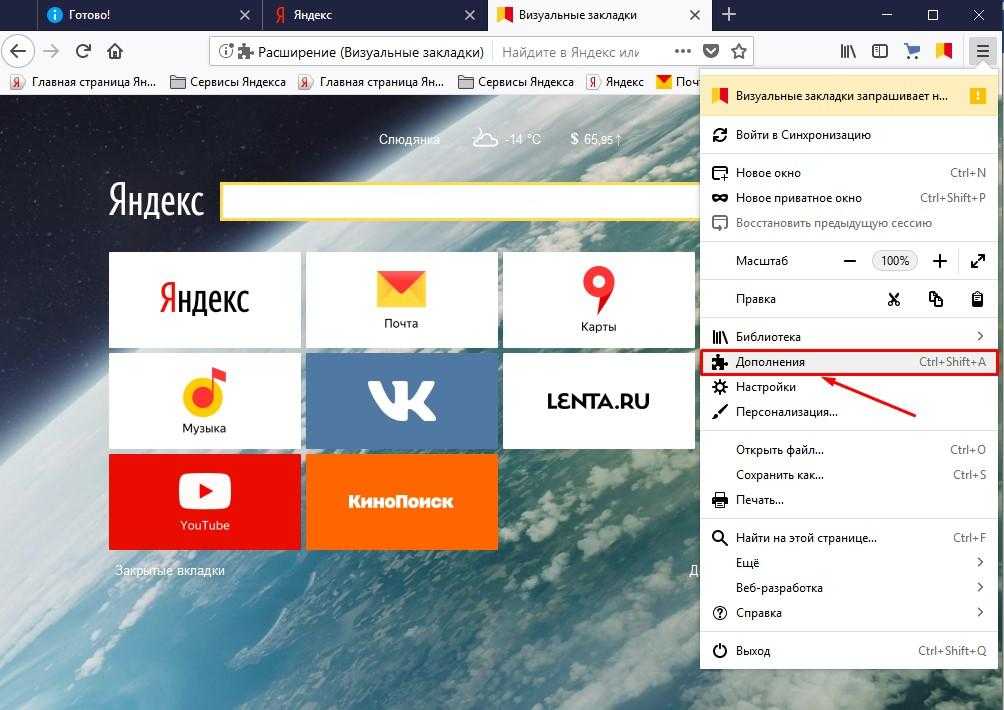 Ну а если вы хотите полностью удалить визуальные закладки от Яндекса, то зайдите в настройки самого браузера и перейдите в раздел «Дополнения».