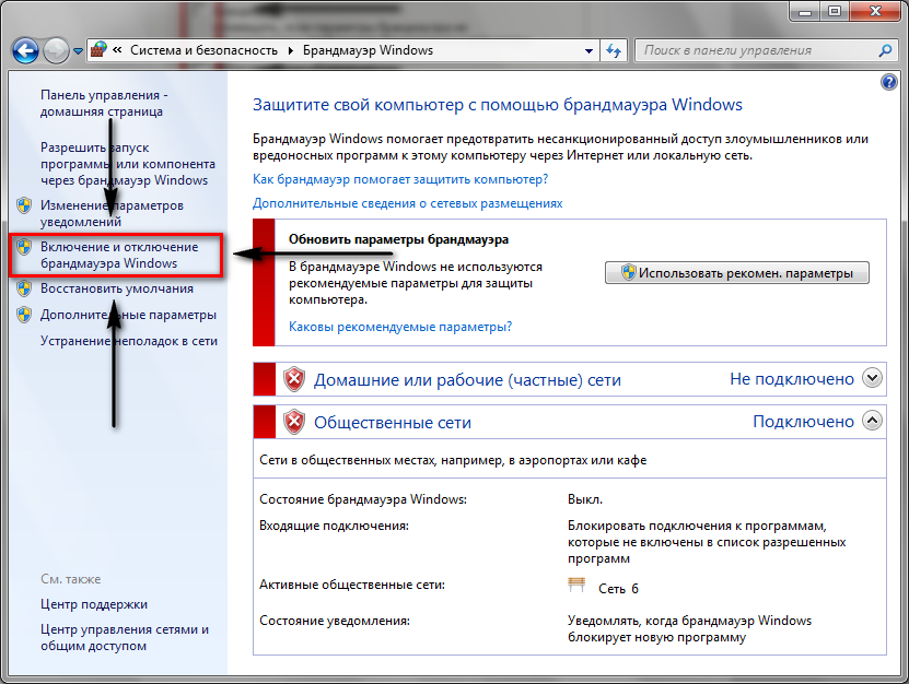 Включение и отключение Брандмауэра Windows.