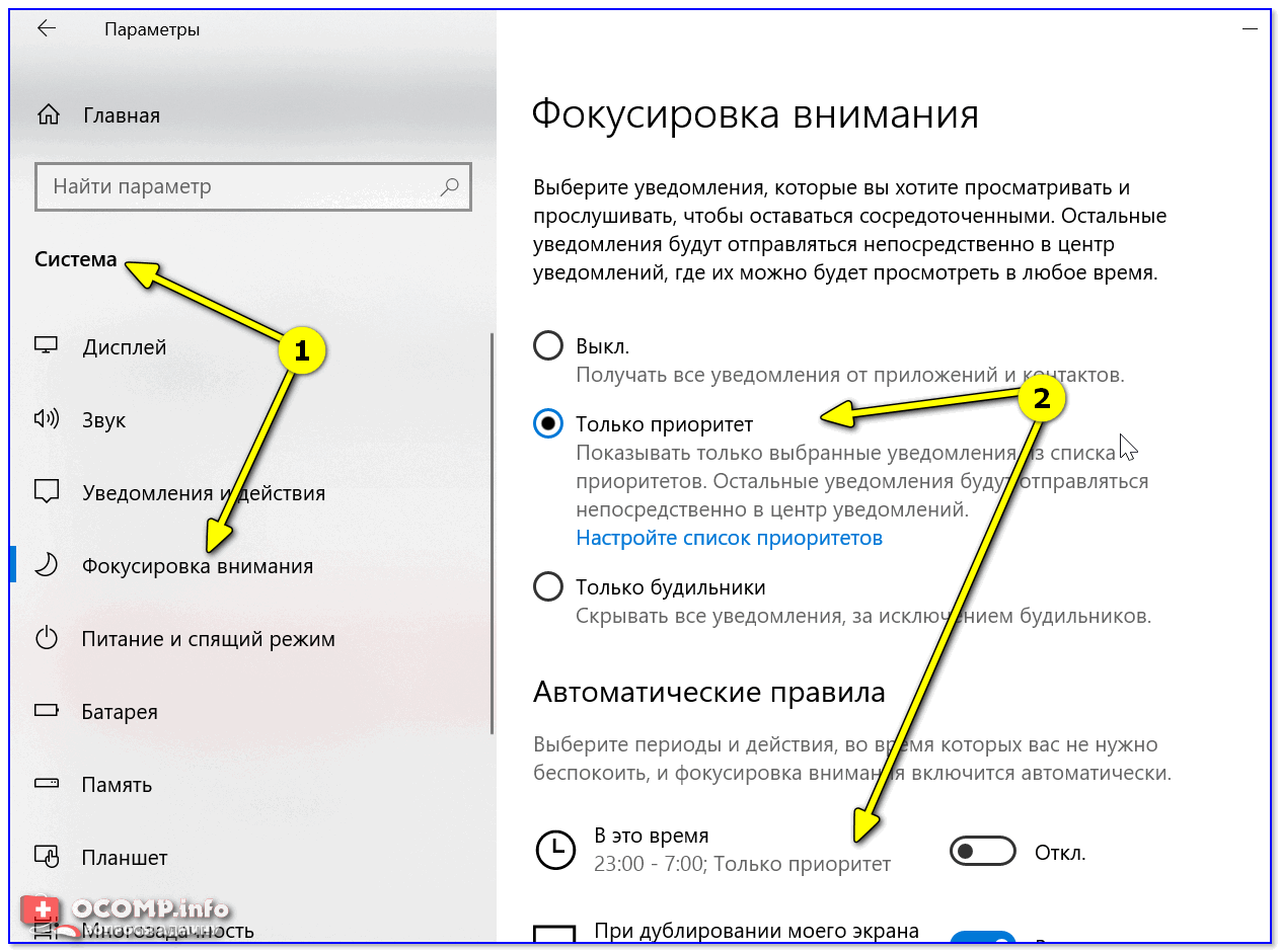 Достаточно перейти в расположение Параметры > Система > Фокусировка внимания. Для включения функции выберите Только приоритет (показывать выбранные уведомления из списка приоритетов) или Только будильники (скрывать все уведомления, кроме будильников).