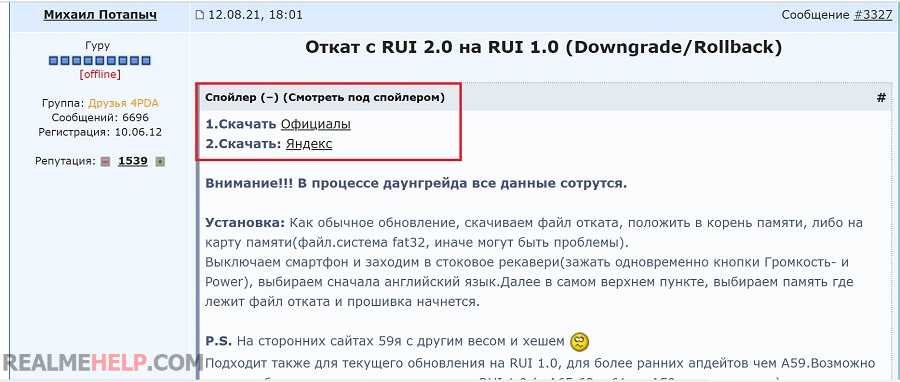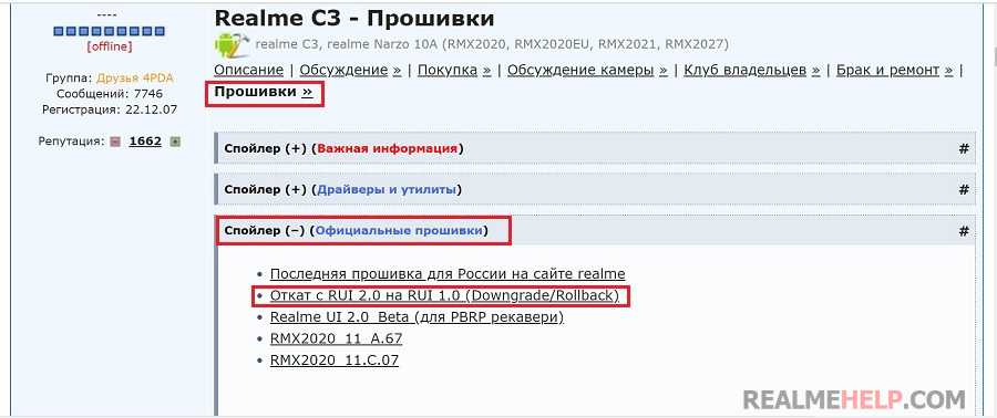 Следующее обязательное действие – скачивание специального файла (архива), с помощью которого и выполнится откат. Файл, предназначенный для конкретной модели, можно найти на форуме 4pda, в ветке со своим телефоном. Обычно необходимая вкладка находится в разделе «Официальные прошивки».