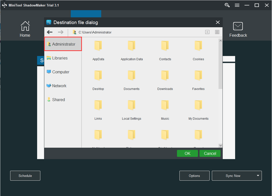 Местоположение 1: нажмите Администратор и выберите из нее папку в качестве места назначения. Затем нажмите Хорошо подтвердить.