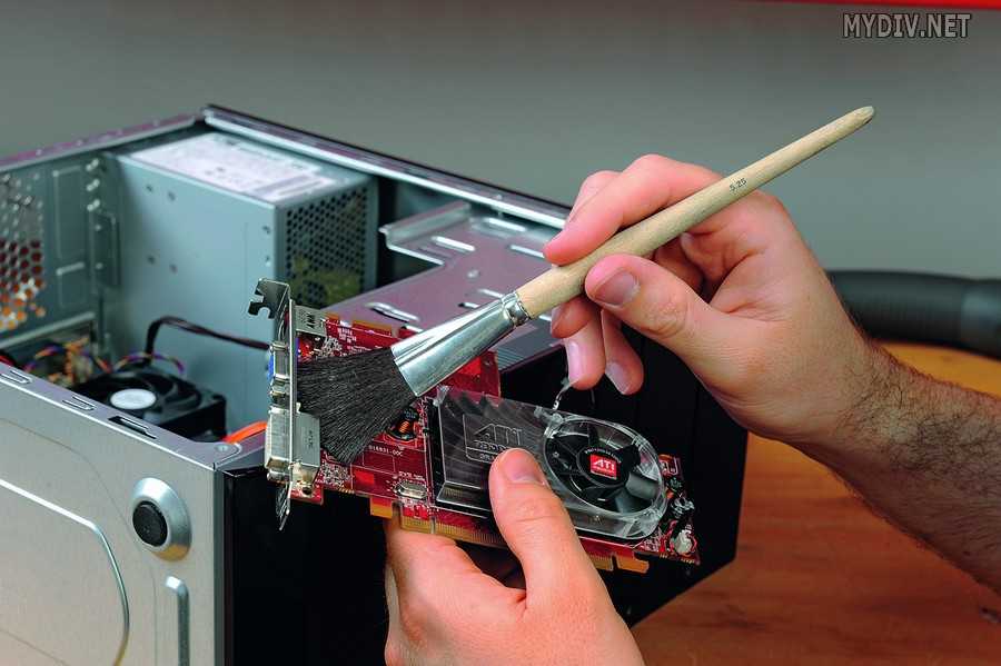 Особое внимание уделите всевозможным кулерам и радиаторам охлаждения, установленным на комплектующих (видеокарте, системной плате, процессоре). Если не получается вымести кисточкой, попробуйте взять тонкую отвертку и уже ею соскрести запрессованную пыль с элементов радиатора и лопаток кулера, только будьте аккуратнее, не погните случайно там чего-нибудь