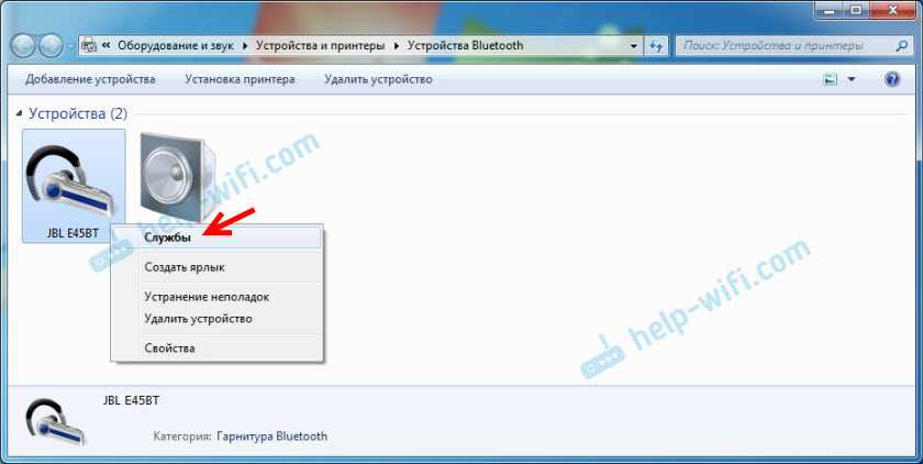 Дальше нужно нажать правой кнопкой мыши на наушники и выбрать «Службы».