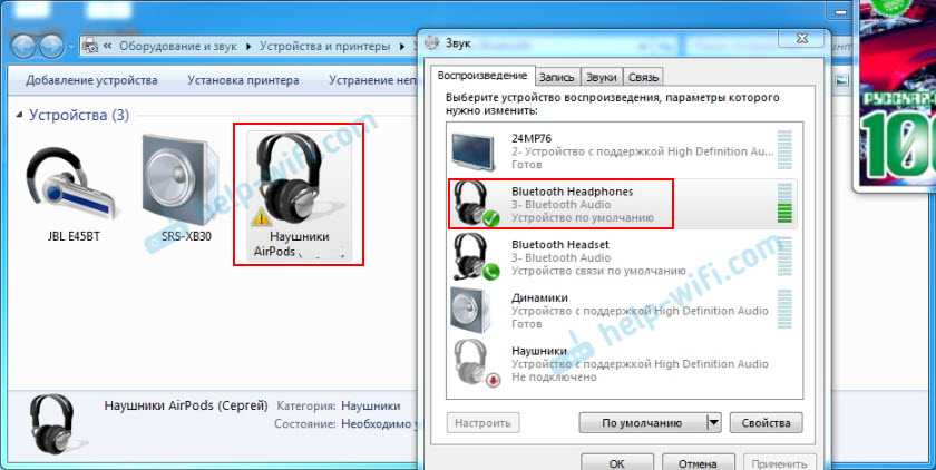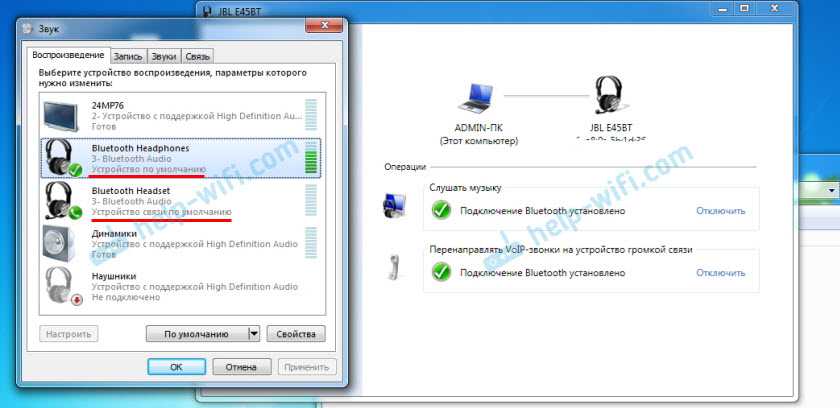 После этого снова заходим в настройки звука (правой кнопкой на иконку звука в трее и выбираем «Устройства воспроизведения») и нажав правой кнопкой мыши на «Bluetooth Headphones» выбираем «Использовать по умолчанию». Если наушники так же будут использоваться как гарнитура (для разговоров в Skype, или в других мессенджерах), то устройство «Bluetooth Headset» делаем как «Устройство связи по умолчанию», нажав на него правой кнопкой мыши и выбрав соответствующий пункт в меню.