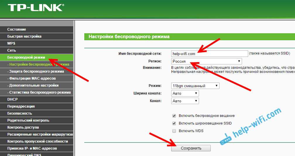 В панели управления открываем вкладку Беспроводной режим. Придумайте название для своей Wi-Fi сети, и запишите его в поле Имя сети. Если хотите, можете оставить стандартное имя. Дальше, в меню Регион выберите свой регион, и нажмите на кнопку Сохранить.