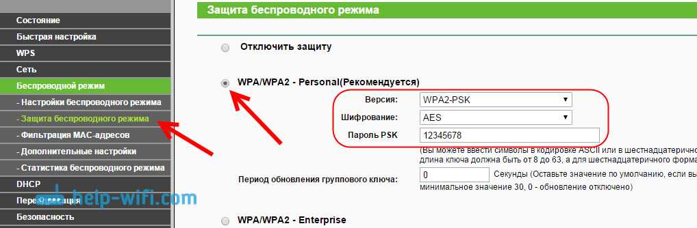 Откройте вкладку Защита беспроводного режима, что бы сменить пароль нашей Wi-Fi сети. Выберите WPA/WPA2 — Personal (рекомендуется), Версия – WPA2-PSK, Шифрование – можно оставить AES. И в поле Пароль PSK запишите пароль (минимум 8 символов), который нужно будет указывать при подключении к вашему Wi-Fi. Нажмите кнопку Сохранить.