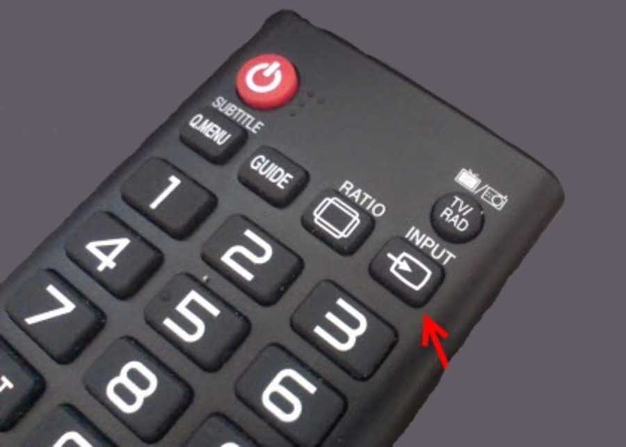 - На пульте дистанционного управления нажмите на кнопку «Input», чтобы открыть список доступных вариантов вывода сигнала на экран телевизора. На некоторых пультах нужная кнопка может отсутствовать. В таких случаях нужно использовать кнопку «Source». Иногда она может не иметь буквенного обозначения, а быть обозначенной в виде иконки квадрата со стрелкой.