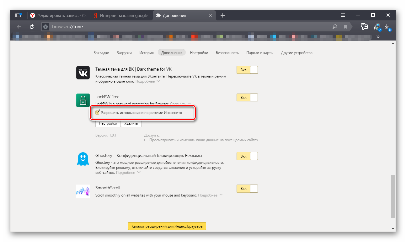 - Отмечаем галочкой пункт «Разрешить использовать в режиме Инкогнито».