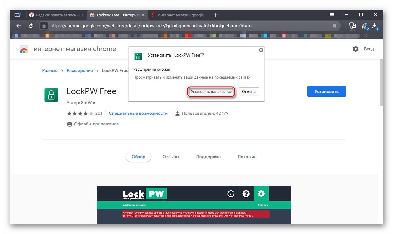 - Для начала заходим в наш хром, заходим в магазин и устанавливаем расширение под названием LockPW. Это самое лучшее из дополнений, которое я пробовал для этого случая.