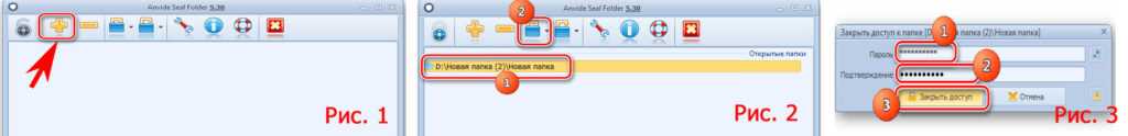 Выбираем с помощью «Плюс» папку которую нужно запаролить и жмете иконку «Закрытый замок». Выскочит окошко, где нужно ввести пароль.
