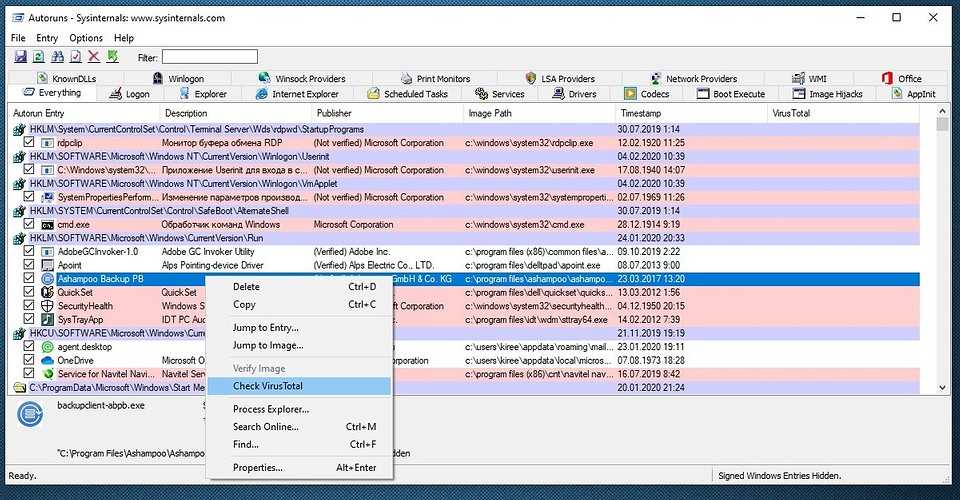 Технически, Autoruns позволяет вам проверять конкретный процесс на наличие вредоносных программ с помощью VirusTotal, который позволяет сканировать файл с использованием длинного списка антивирусных ядер. Благодаря объединению этой опции, приложение Sysinternals автоматизирует весь процесс, упрощая определение того, заражен ли конкретный исполняемый файл или нет. Результат сканирования можно увидеть в колонке Virus Total — сколько антивирусных движков проверили данный объект.