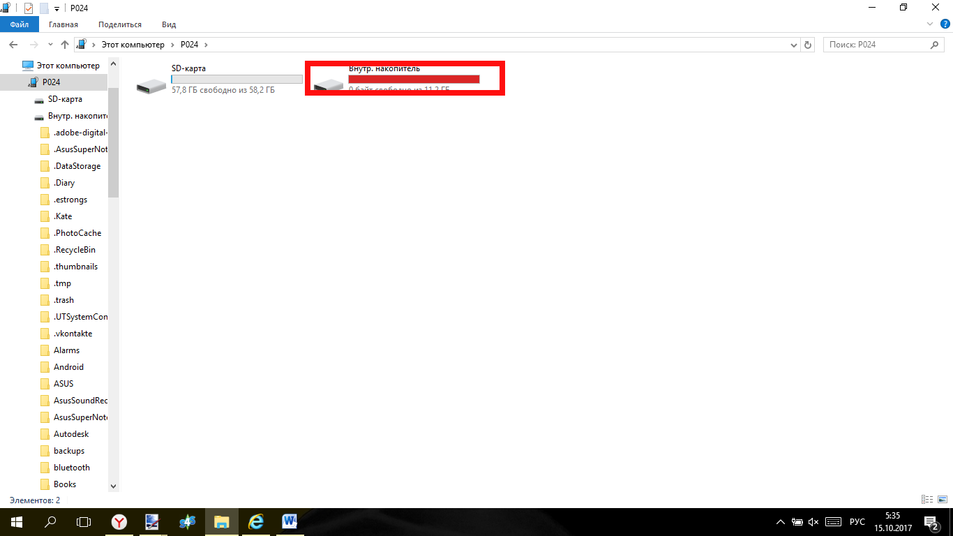 6Если такого запроса не последовало, то сразу после двойного клика на ярлыке в меню Мой Компьютер, откроется список носителей – SD-карта и Внутренний накопитель;