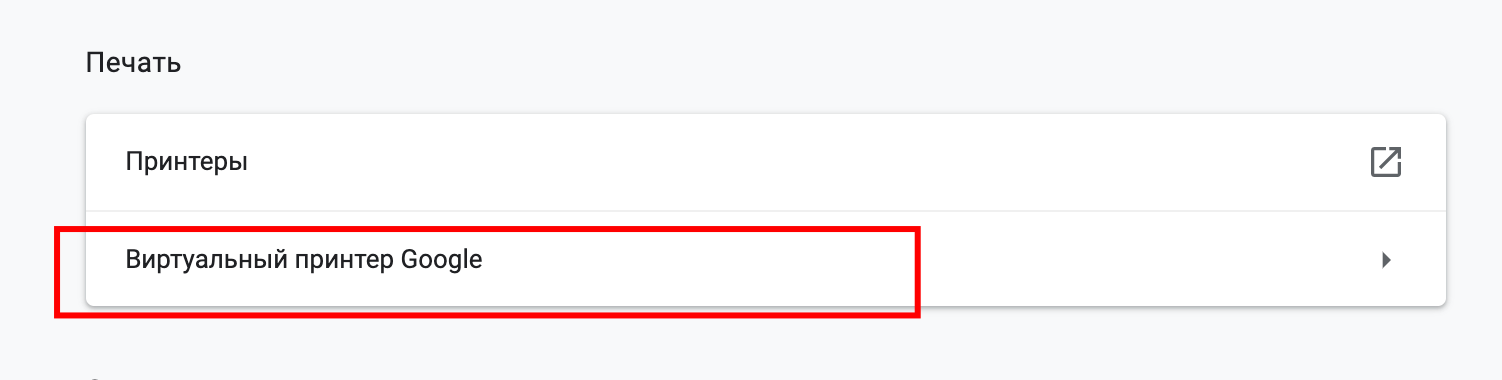 Найдите радел настроек Печать. Перейдите в подраздел Виртуальный принтер Google.