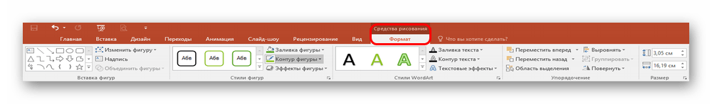 Когда объект создан/добавлен, его можно перемещать по слайду и настраивать (менять размер, цвет, форму и т. д.). У каждого элемента есть свои настройки (у таблиц — одни, у надписей — другие, у изображений — третьи), изменить которые можно щелкнув по нему, а затем — на появившуюся вкладку «Формат».