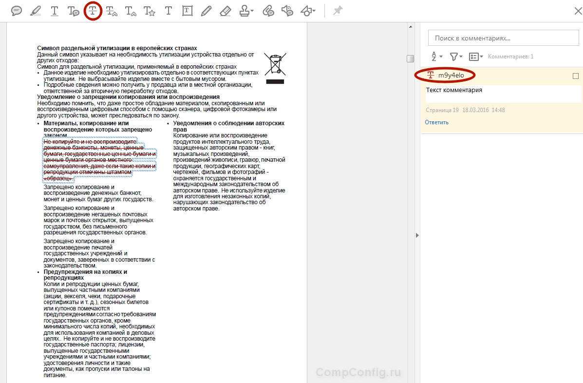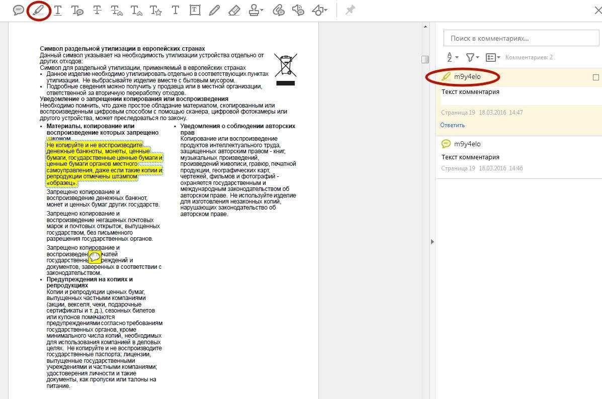 Выделить часть текста цветом можно с помощью инструмента «Выделить текст», который также находится в панели комментариев. Кликните по значку в виде желтого маркера, выделите нужный участок текста, и он окрасится в желтый цвет (по умолчанию). Цвет выделения и уровень прозрачности можно изменить, щелкнув по выделенному фрагменту правой клавишей мышки и в открывшемся диалоговом окне выбрав пункт «Свойства». Создать комментарий для выделенного участка текста можно при помощи двойного клика левой клавишей мышки по панели со списком комментариев справа (см. скриншот ниже).