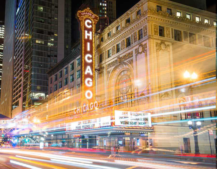 Эту фотографию Chicago Theater я сделал в то время, когда преподавал фотосъемку перед выступлением на конференции. Преимущество ночной съемки в городе – можно запечатлеть длинные полосы фар проезжающих машин.