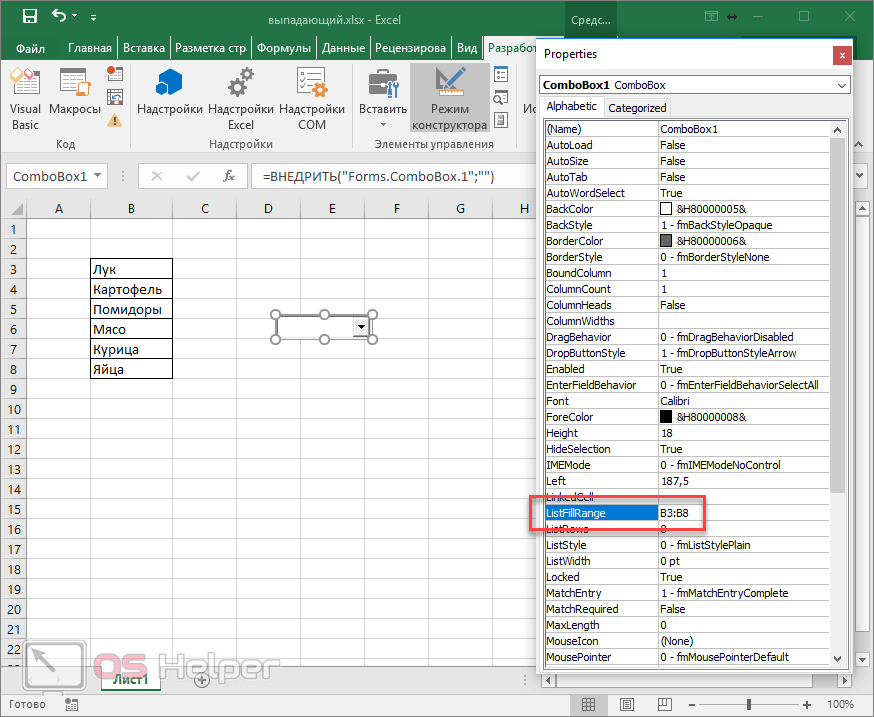 - ListRows — количество данных в выпадающем списке. Элемент ActiveX отличается от первого способа тем, что можно указать большое количество данных.