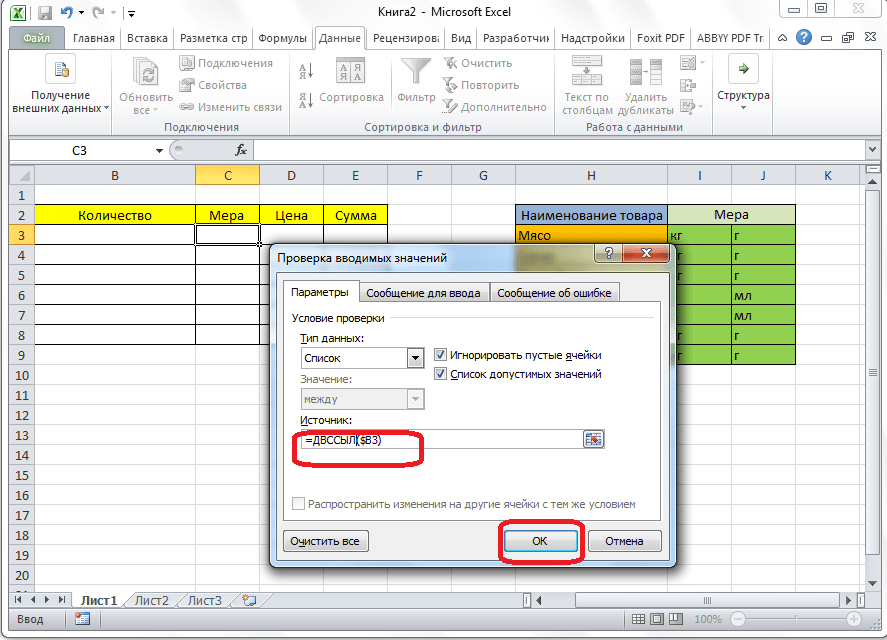Во второй ячейке тоже запускаем окно проверки данных, но в графе «Источник» вводим функцию «=ДВССЫЛ» и адрес первой ячейки. Например, =ДВССЫЛ($B3).