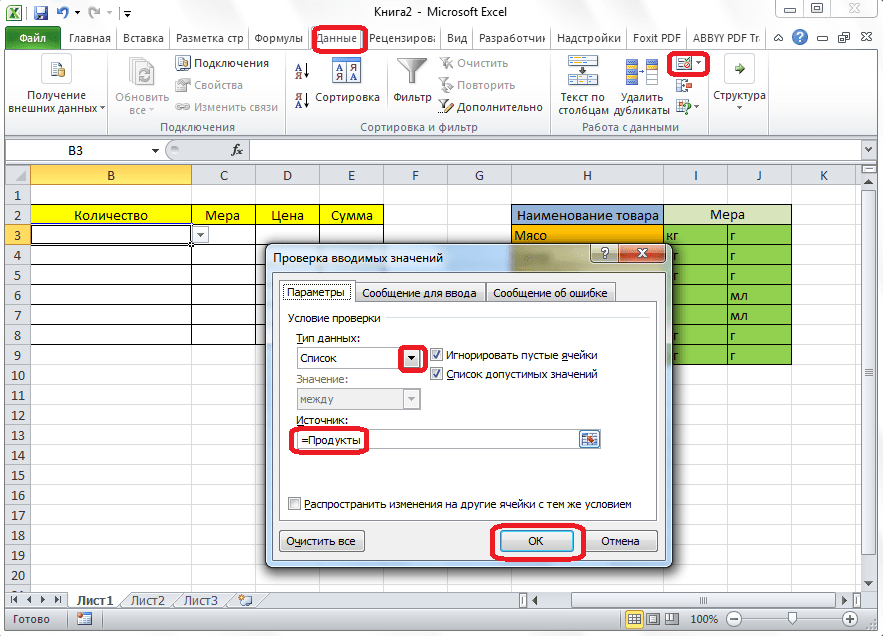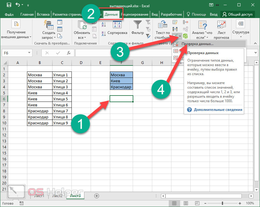 В первой ячейке создаём список точно таким же образом, как делали это ранее, через проверку данных.