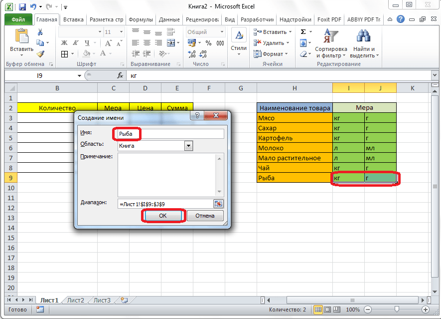 Именуя диапазон значений, важно использовать вместо пробела нижнее подчеркивание «_». Например, «Мясные_блюда»