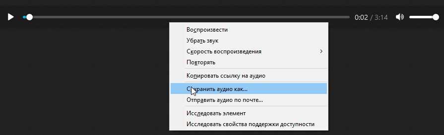 Щелкните правой кнопкой мыши по любому месту черного экрана и выберите пункт Сохранить аудио как…